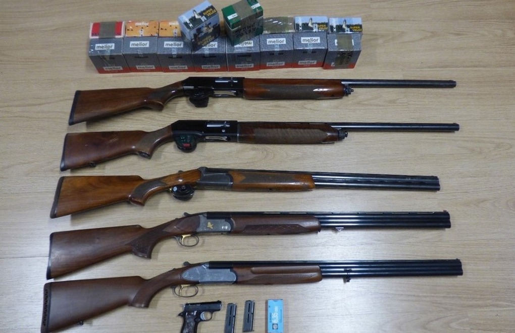 Na sequência das diligências policiais foi realizada uma busca domiciliária e uma busca não domiciliaria em veículo, que culminou na apreensão de cinco caçadeiras, uma arma de fogo e 445 munições.