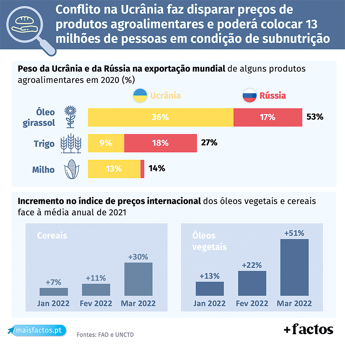 O conflito entre a Rússia e a Ucrânia teve um enorme impacto no preço dos produtos agroalimentares nos mercados internacionais. Durante o mês de março deste ano, o índice de preços dos óleos vegetais cresceu cerca de 51% face à média anual de 2021 e +23% que fevereiro. No caso dos cereais, os preços subiram 30% face à média de 2021 e +17% comparativamente com fevereiro.