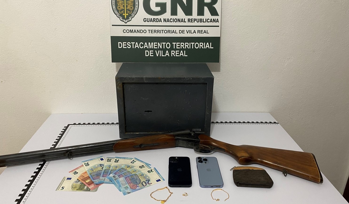 Em comunicado, a GNR explica que o Núcleo de Investigação Criminal (NIC) esteve a investigar um furto no interior de residência durante cerca de quatro meses, sendo que os militares da Guarda “efetuaram diversas diligências policiais que culminaram na identificação e localização do suspeito”, tendo sido dado cumprimento a 11 mandados de busca, concretamente, uma domiciliária, uma em oficina, duas em veículo e sete em armazéns, que culminaram na apreensão de um cofre, uma caçadeira, das pulseiras em ouro, dois pendentes em ouro, dois telemóveis e 135 euros em numerário.