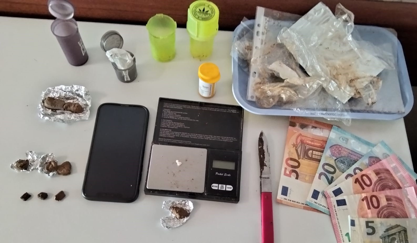 Na sequência da detenção, foi dado cumprimento a dois mandados de busca domiciliária, em que lhe foi apreendido 16 doses de haxixe, uma dose de MDMA, 115 euros, um telemóvel, uma balança digital para pesar o estupefaciente e vários artefactos destinados ao corte e manipulação.