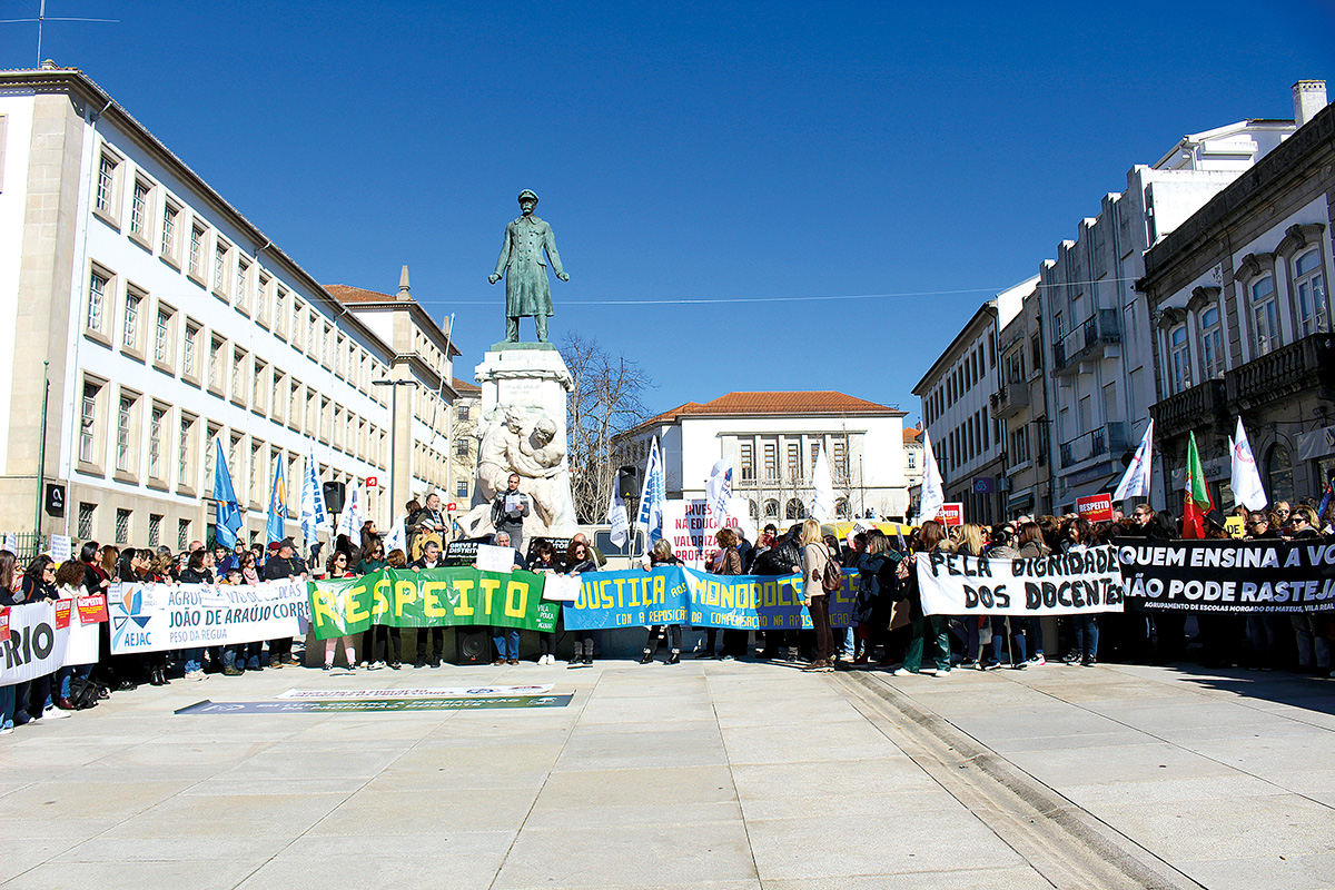Com apitos nos lábios, os professores fizeram-se ouvir, entoando palavras de ordem como “Não paramos”, “Portugal escuta, a escola está em luta”, ou “Para cá do Marão lutamos pela educação”.