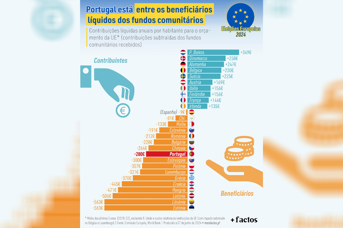 Em média, Portugal beneficiou, em termos líquidos e anualmente, de 280€ dos fundos europeus por habitante, ou seja, beneficia mais do que aquilo que contribui para o orçamento da União Europeia. As contribuições médias anuais de 212€ por cada português, nos últimos 5 anos com dados disponíveis para o orçamento da UE, foram largamente compensadas por 492€ por cada habitante, recebidos através de fundos comunitários.