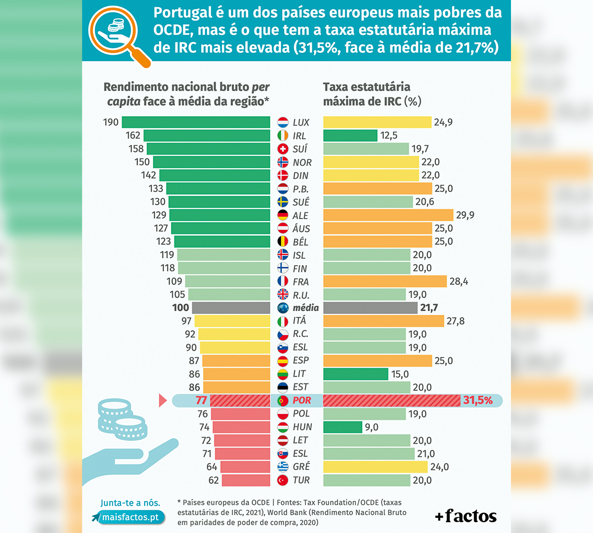 Destes países, Eslováquia é o que tem a taxa mais elevada, mas não passa de 21%, cerca de 10 pontos percentuais abaixo de Portugal. Os países mais pobres tendem a implementar sistemas fiscais mais competitivos para compensar as suas debilidades económicas, mas Portugal não segue essa tendência.