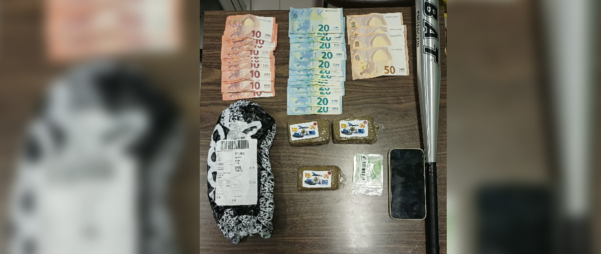 Da intervenção policial resultou a apreensão de 3 111 doses de haxixe, 7 doses de cocaína, 28 doses de MDMA (ecstasy), a quantia monetária de 1 110 euros, um taco de basebol, um telemóvel e uma bolsa.